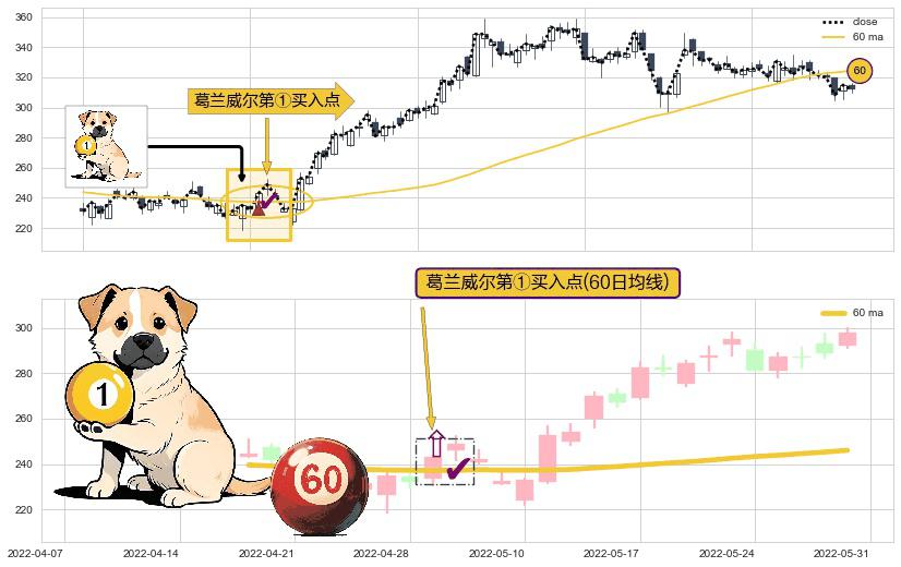 ⚀ 2022-04-29-日显现 葛兰威尔均线 60日均线 第买①入点 走势反转见底信号,后市看涨,买进信号