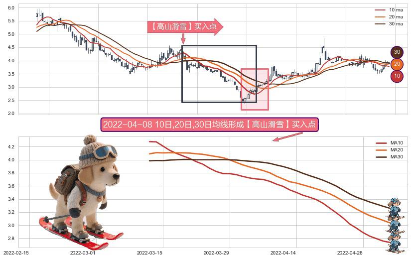 形态多维评估: ⚀ 2022-03-11日-2022-05-09日显现 10日-20日-30日均线 【高山滑雪】买入点 看多信号,后市看涨,买入