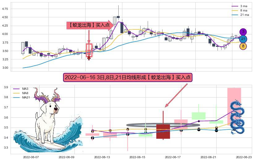 形态多维评估: ⚀ 2022-06-16日显现 3日-8日-21日均线 【蛟龙出海】买入点 看多信号,后市看涨,买入