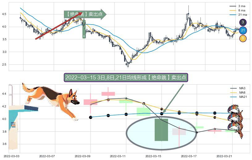 形态多维评估: ⚀ 2022-03-15日显现 3日-8日-21日均线 【绝命跳】卖出点 看空信号,后市看跌,卖出