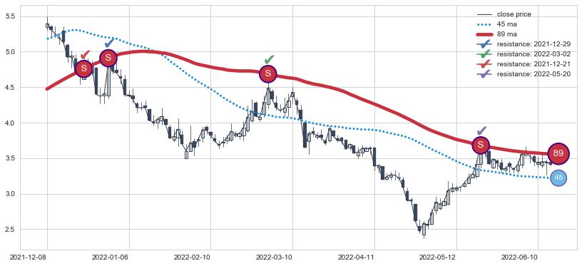下跌趋势2021-12-08-2022-06-15,均线89确认关键阻力4处