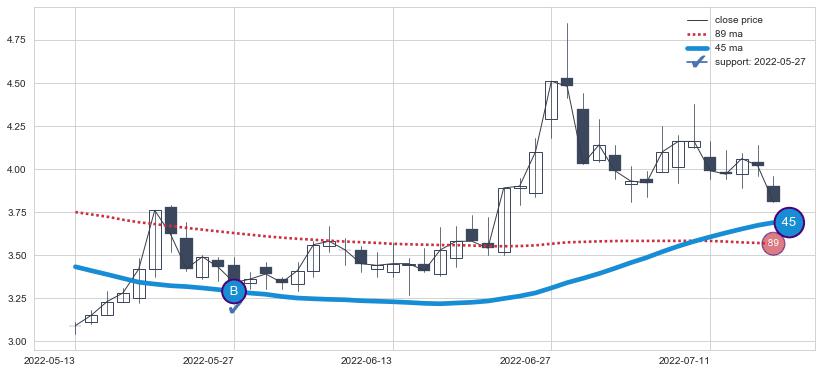 上涨趋势2022-05-13-2022-07-15,均线45确认关键支撑1处