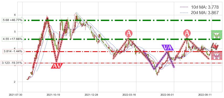 ♘ 阻力价格位5.68,可信任强度93.91%,距离最后交易2022-08-12形成的收盘价格3.870相差 +46.77%