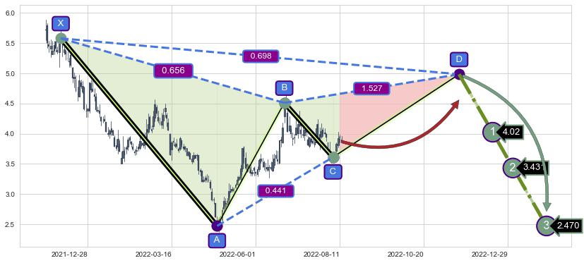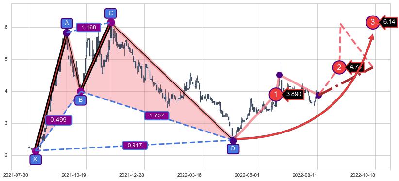 ➣ 未完成【伽利】形态起点X: 2021-12-06, 已到达C点: 2022-08-05, 预测最终D点: 2022-11-18, 共237交易日