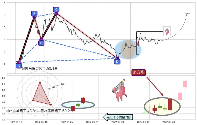 | 3 🅚:【蛟龙出海】买入点 ➕ 📡:谐波赛福已到达d点:猜想c下行到达d点后报复性拉升上涨(均值回复) ☞ 看多信号 ⇥ 【均线】交织【图形】⇥ 综合量化分数: 54 | > |