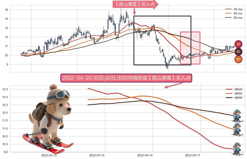 ⚀ 2022-03-04日-2022-06-07日显现 30日-60日-90日均线 【高山滑雪】买入点 看多信号,后市看涨,买入