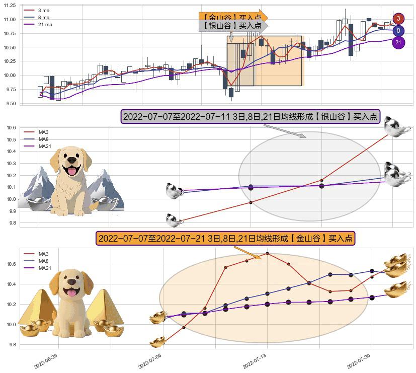 ⚀ 2022-07-08-日至2022-07-21-日显现 3日-8日-21日均线 【金山谷】买入点 其再次确认了买入信号,可靠性更强,买入