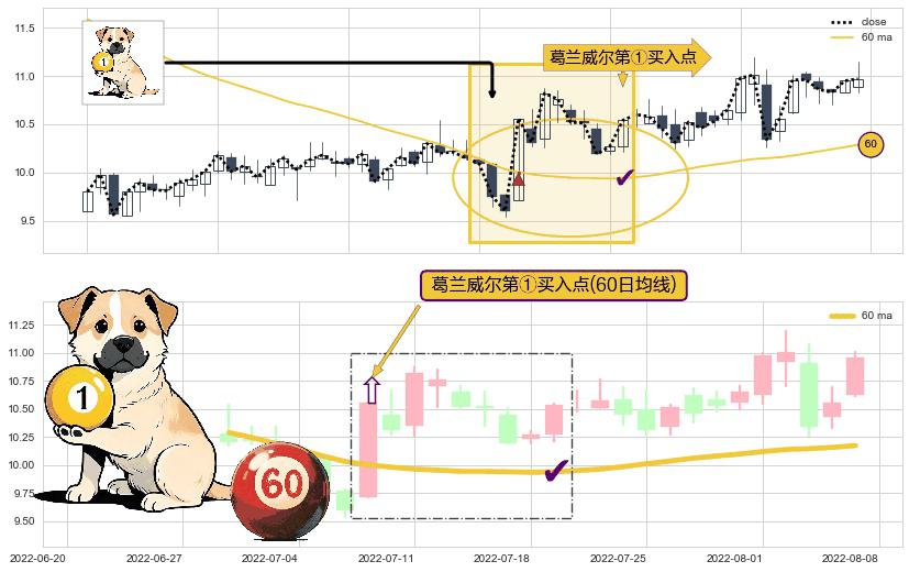 ⚀ 2022-07-07-日显现 葛兰威尔均线 60日均线 第买①入点 走势反转见底信号,后市看涨,买进信号