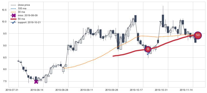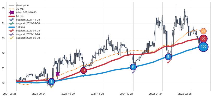 ⚁ MA3和MA8走势平行,且始终保持在短距离内,MA21始终在短中期均线下方,与短中期均线保持一定的距离,微微上行