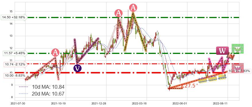 ♘ 阻力价格位14.50,可信任强度74.08%,距离最后交易2022-08-12形成的收盘价格10.97相差 +32.18%