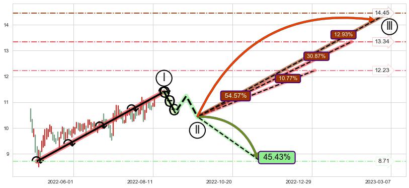 ➢ 循环浪继续向上【最高】位置(2023-03-07, 14.45),匹配聚类样本比例23.70%, 可能性概率12.93%