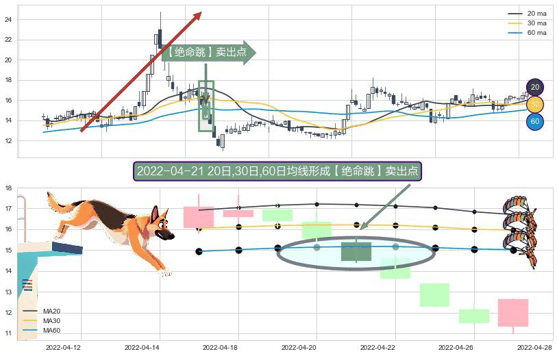 形态多维评估: ⚀ 2022-04-21日显现 20日-30日-60日均线 【绝命跳】卖出点 看空信号,后市看跌,卖出