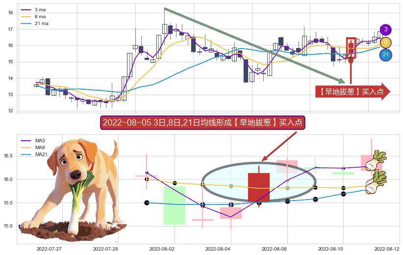形态多维评估: ⚀ 2022-08-05日显现 3日-8日-21日均线 【旱地拔葱】买入点 看多信号,后市看涨,买入