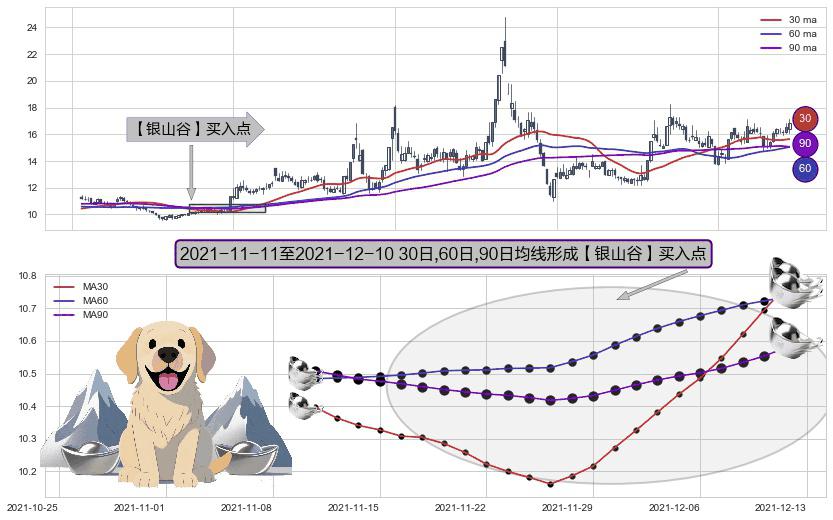 形态多维评估: ⚀ 2021-11-12-日至2021-12-10-日显现 30日-60日-90日均线 【银山谷】买入点 看多信号,后市看涨,买入