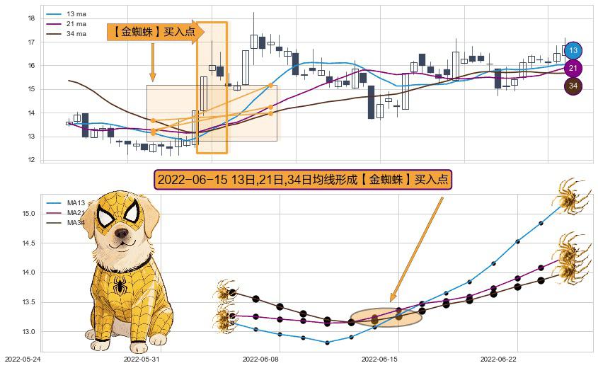 形态多维评估: ⚀ 2022-06-15日显现 13日-21日-34日均线 【金蜘蛛】买入点 看多信号,后市看涨,买入