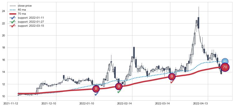 上涨趋势2021-11-12-2022-04-22,均线70确认关键支撑3处
