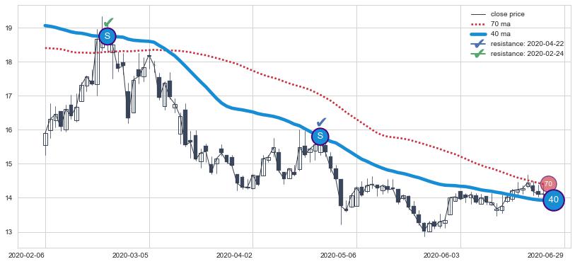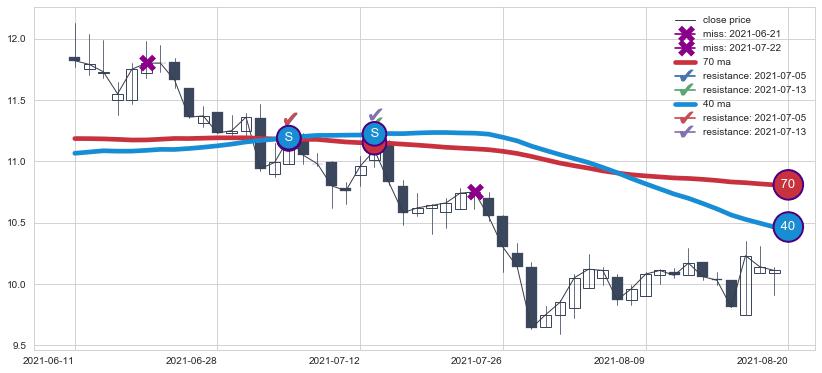 下跌趋势2021-06-11-2021-08-20,均线40, 70确认关键阻力2处