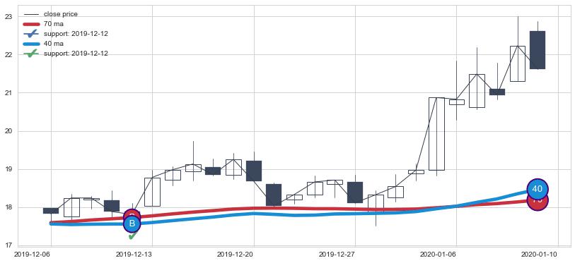 上涨趋势2019-12-06-2020-01-10,均线40, 70确认关键支撑1处
