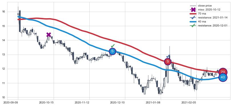 下跌趋势2020-09-09-2021-03-03,均线40, 70确认关键阻力2处