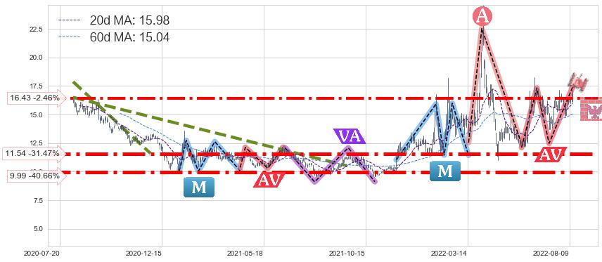 ♘ 支撑价格位16.43,可信任强度76.98%,距离最后交易2022-08-12形成的收盘价格16.84相差 -2.46%