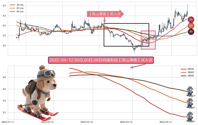 形态多维评估: ⚀ 2022-02-25日-2022-05-27日显现 30日-60日-90日均线 【高山滑雪】买入点 看多信号,后市看涨,买入