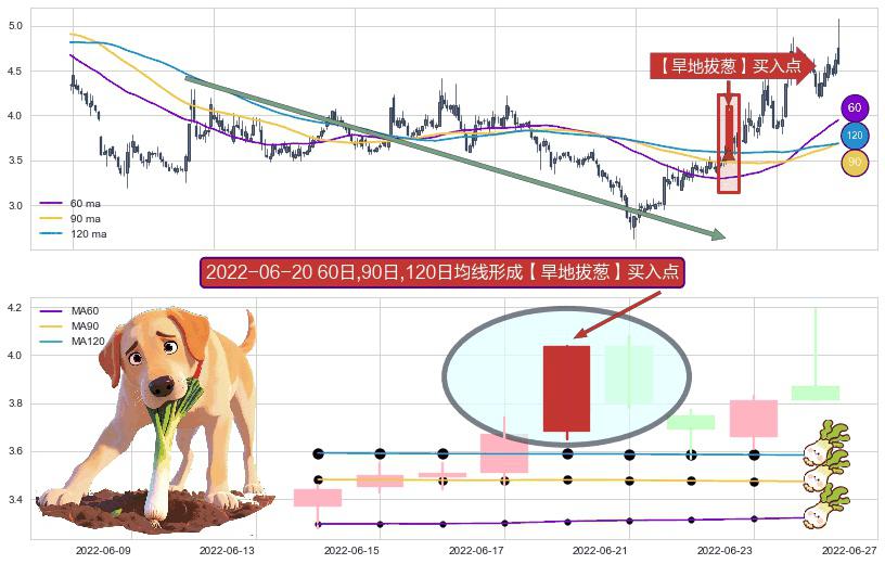 形态多维评估: ⚀ 2022-06-20日显现 60日-90日-120日均线 【旱地拔葱】买入点 看多信号,后市看涨,买入