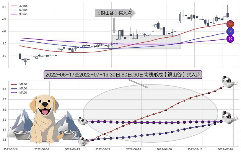 形态多维评估: ⚀ 2022-06-20-日至2022-07-19-日显现 30日-60日-90日均线 【银山谷】买入点 看多信号,后市看涨,买入