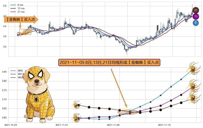 形态多维评估: ⚀ 2021-11-09日显现 8日-13日-21日均线 【金蜘蛛】买入点 看多信号,后市看涨,买入