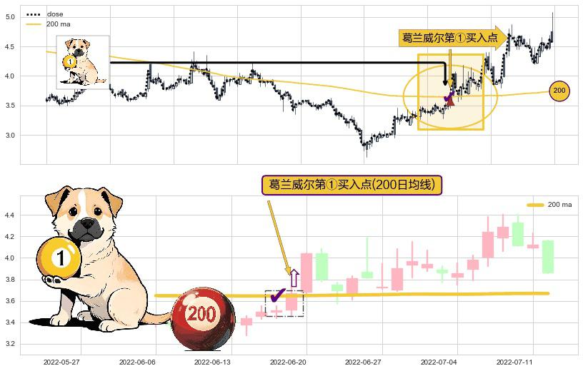 形态多维评估: ⚀ 2022-06-17-日显现 葛兰威尔均线 200日均线 第买①入点 走势反转见底信号,后市看涨,买进信号