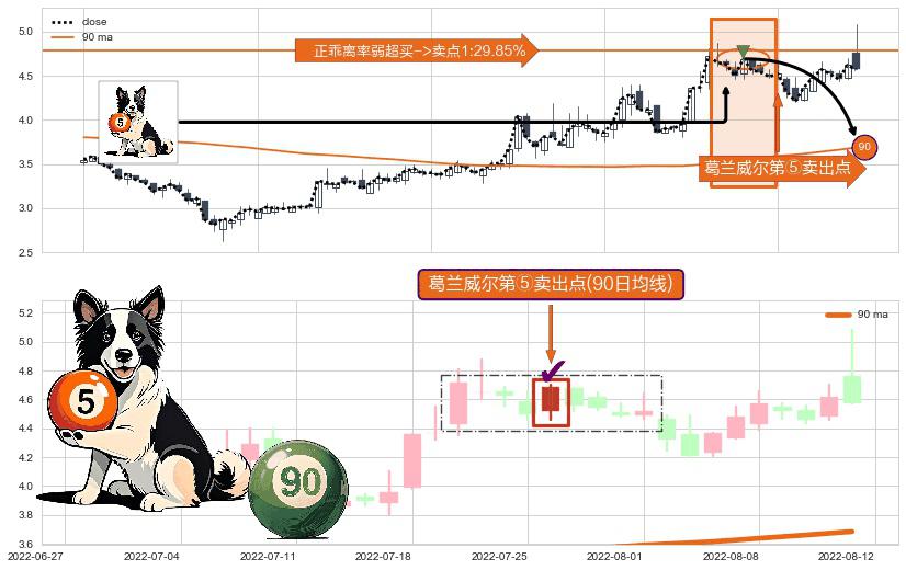形态多维评估: ⚀ 2022-07-26-日显现 葛兰威尔均线 90日均线 第⑤卖出点 上升趋势均值回复的短线回落信号,后市看跌,卖出信号