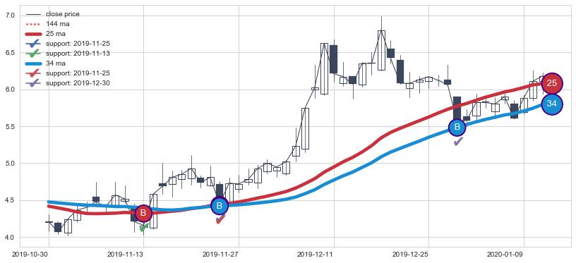 上涨趋势2019-10-30-2020-01-13,均线25, 34确认关键支撑3处