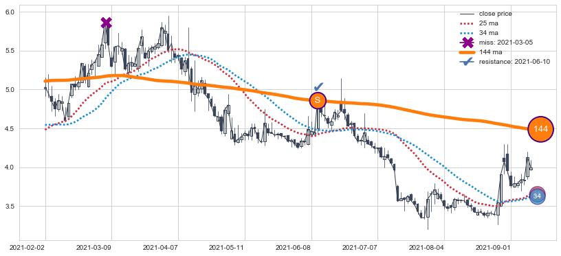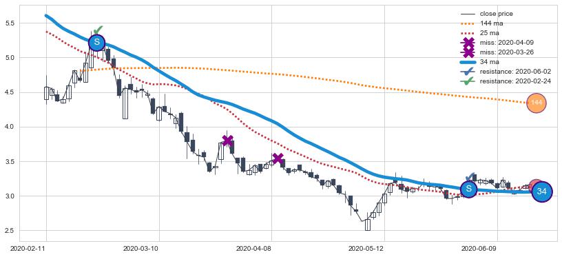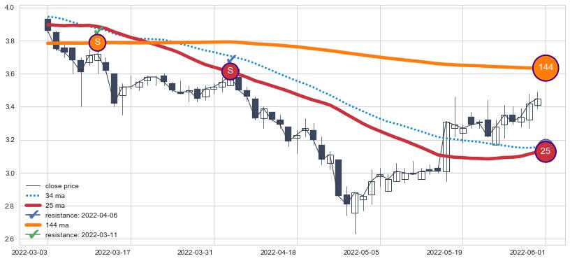下跌趋势2022-03-03-2022-06-01,均线144, 25确认关键阻力2处