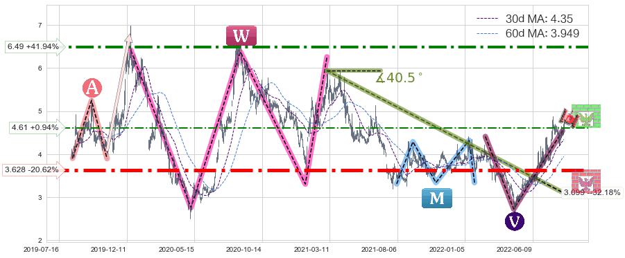 ➣ 【仅预测突破】最后价格:4.57与预测突破价格:4.33→【空间中等】后续最小【整理】第一目标价格→(2022-10-12: 2.244 )