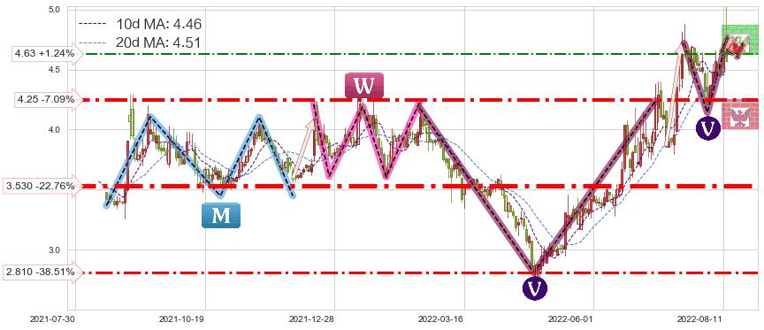 ♘ 阻力价格位4.63,可信任强度52.62%,距离最后交易2022-08-12形成的收盘价格4.57相差 +1.24%