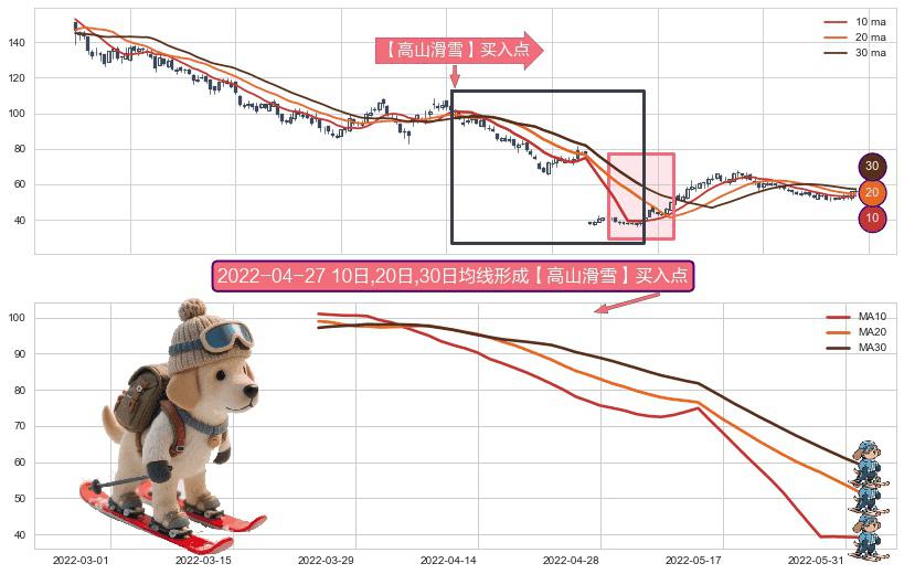 ⚀ 2022-03-24日-2022-06-01日显现 10日-20日-30日均线 【高山滑雪】买入点 看多信号,后市看涨,买入