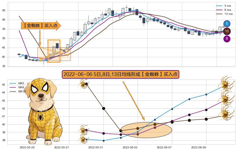 ⚀ 2022-06-06日显现 5日-8日-13日均线 【金蜘蛛】买入点 看多信号,后市看涨,买入