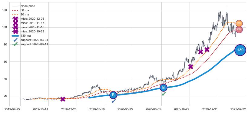 ⚁ MA3和MA8走势平行,且始终保持在短距离内,MA21始终在短中期均线下方,与短中期均线保持一定的距离,微微上行