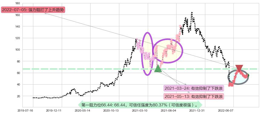 2022-07-05: 第一阻力位66.44强力阻拦了上升趋势,成功阻止了价格的继续上涨。