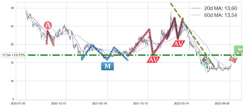 ♘ 阻力价格位17.04,可信任强度75.64%,距离最后交易2022-08-12形成的收盘价格14.72相差 +15.77%