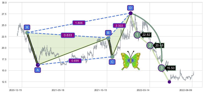 ➣ 已完成【蝴蝶】形态起点X: 2020-12-31, 终点D: 2021-12-31, 共244交易日