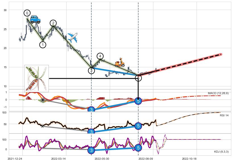 ➢ 1,3,5驱动浪MACD, RSI, KDJ走势都出现【常规背离】反转信号增强