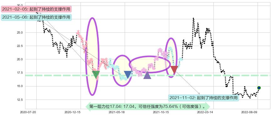 ♞ 第一阻力位17.04价格为17.04,其通过量化计算出的可信任强度为75.64%(可信度强)。