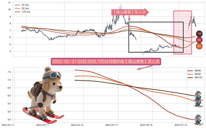 ⚀ 2022-04-01日-2022-07-20日显现 60日-90日-120日均线 【高山滑雪】买入点 看多信号,后市看涨,买入