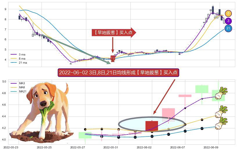 ⚀ 2022-06-02日显现 3日-8日-21日均线 【旱地拔葱】买入点 看多信号,后市看涨,买入