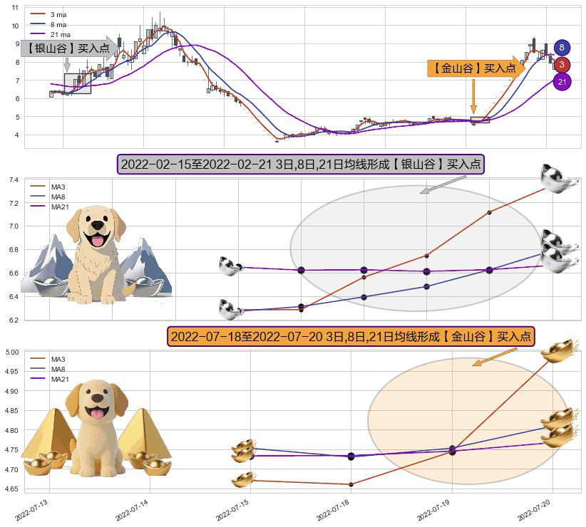 ⚀ 2022-07-19-日至2022-07-20-日显现 3日-8日-21日均线 【金山谷】买入点 其再次确认了买入信号,可靠性更强,买入