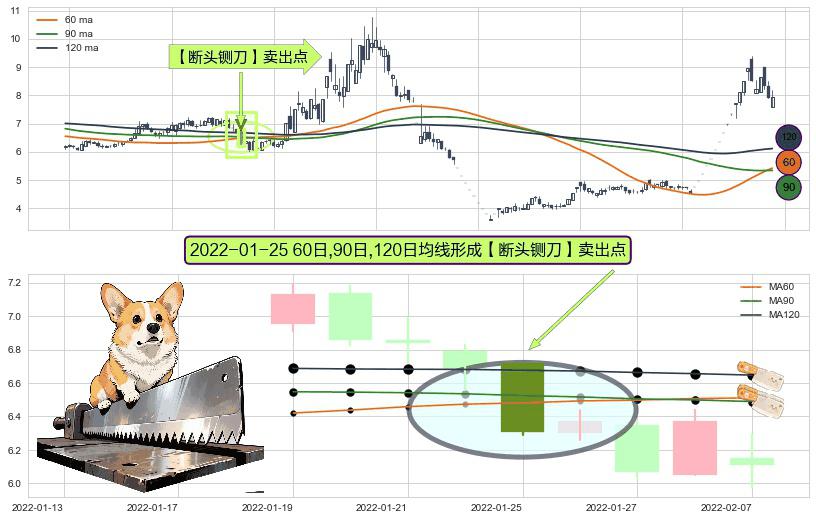 ⚀ 2022-01-25日显现 60日-90日-120日均线 【断头铡刀】卖出点 看空信号,后市看跌,卖出