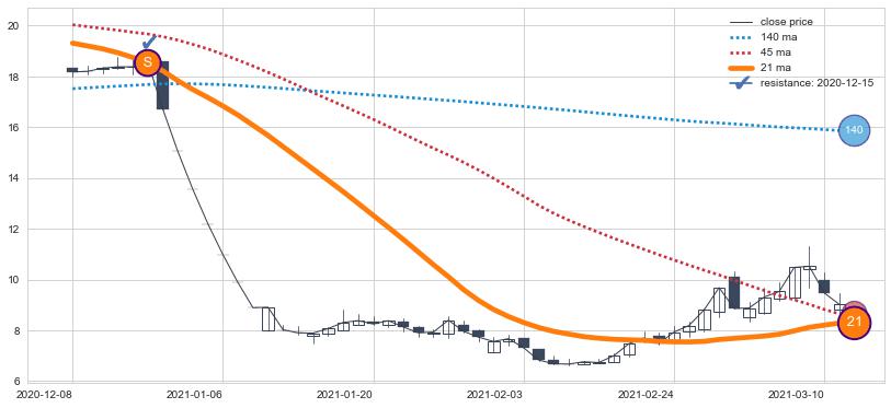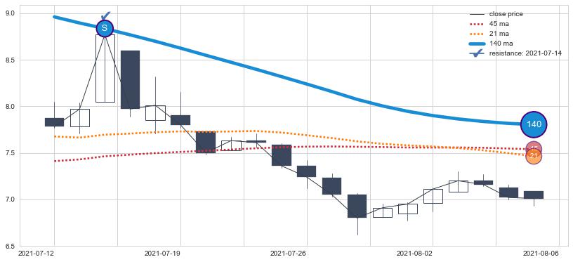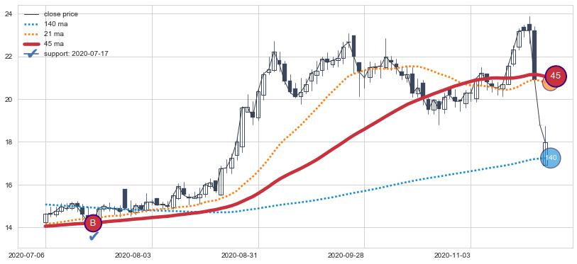 ⚁ MA3和MA8走势平行,且始终保持在短距离内,MA21始终在短中期均线下方,与短中期均线保持一定的距离,微微上行