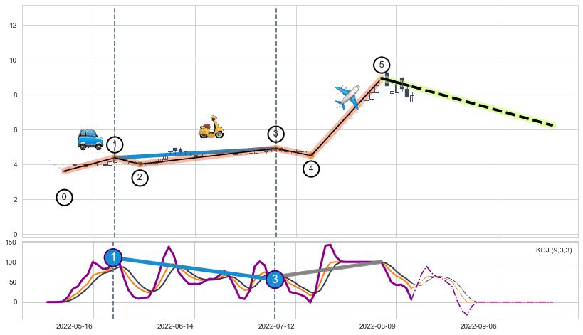 ➣ 第一, 三驱动浪端点:【KDJ】走势出现【常规背离 & 反转信号】背离程度99.00%,背离夹角角度43.6˚,背离程度较大