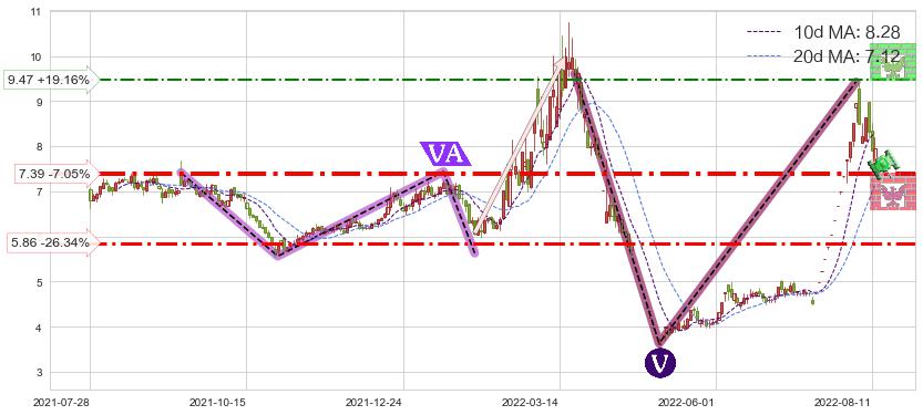 ♘ 阻力价格位9.47,可信任强度52.50%,距离最后交易2022-08-12形成的收盘价格7.95相差 +19.16%