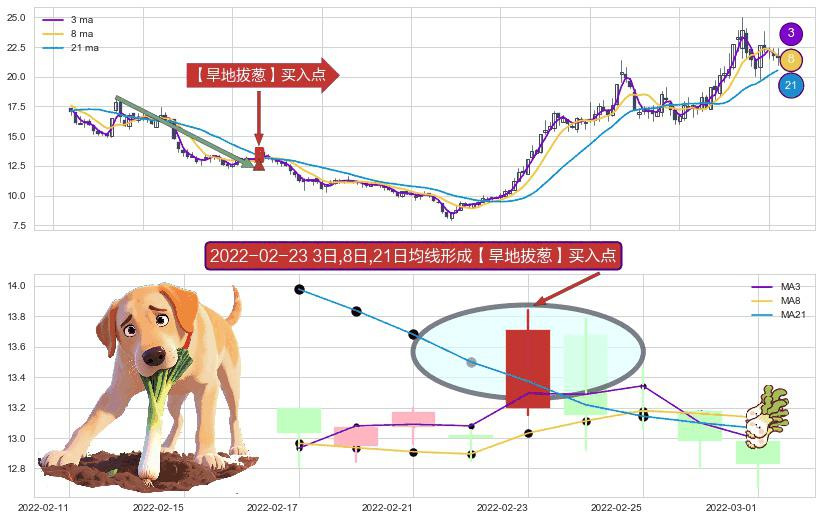 形态多维评估: ⚀ 2022-02-23日显现 3日-8日-21日均线 【旱地拔葱】买入点 看多信号,后市看涨,买入
